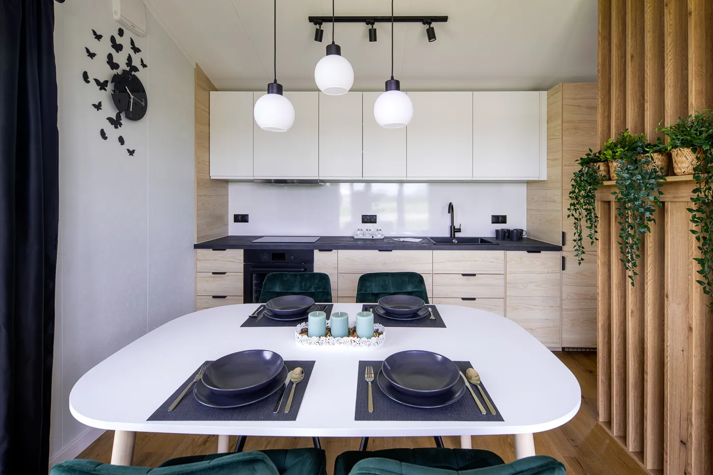 De woning wordt geleverd met een volledig afgewerkt interieur inclusief vaste meubels, huishoudelijke apparatuur en complete badkameruitrusting. Hierdoor kan de woning direct na plaatsing worden gebruikt, zonder aanvullende afwerkings- of installatiewerkzaamheden.
