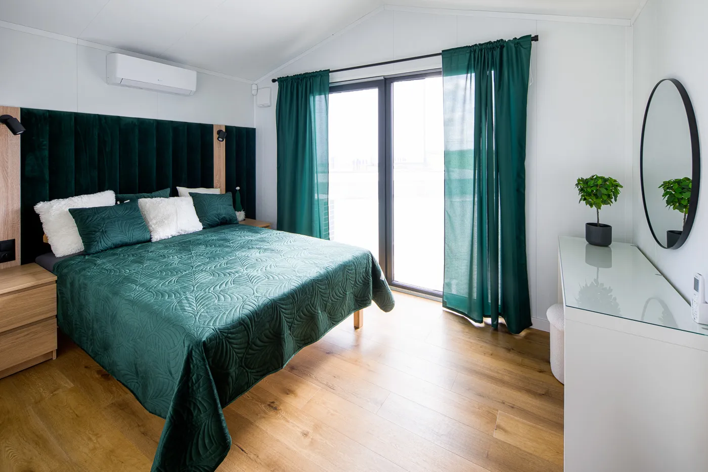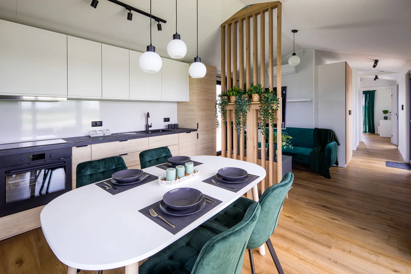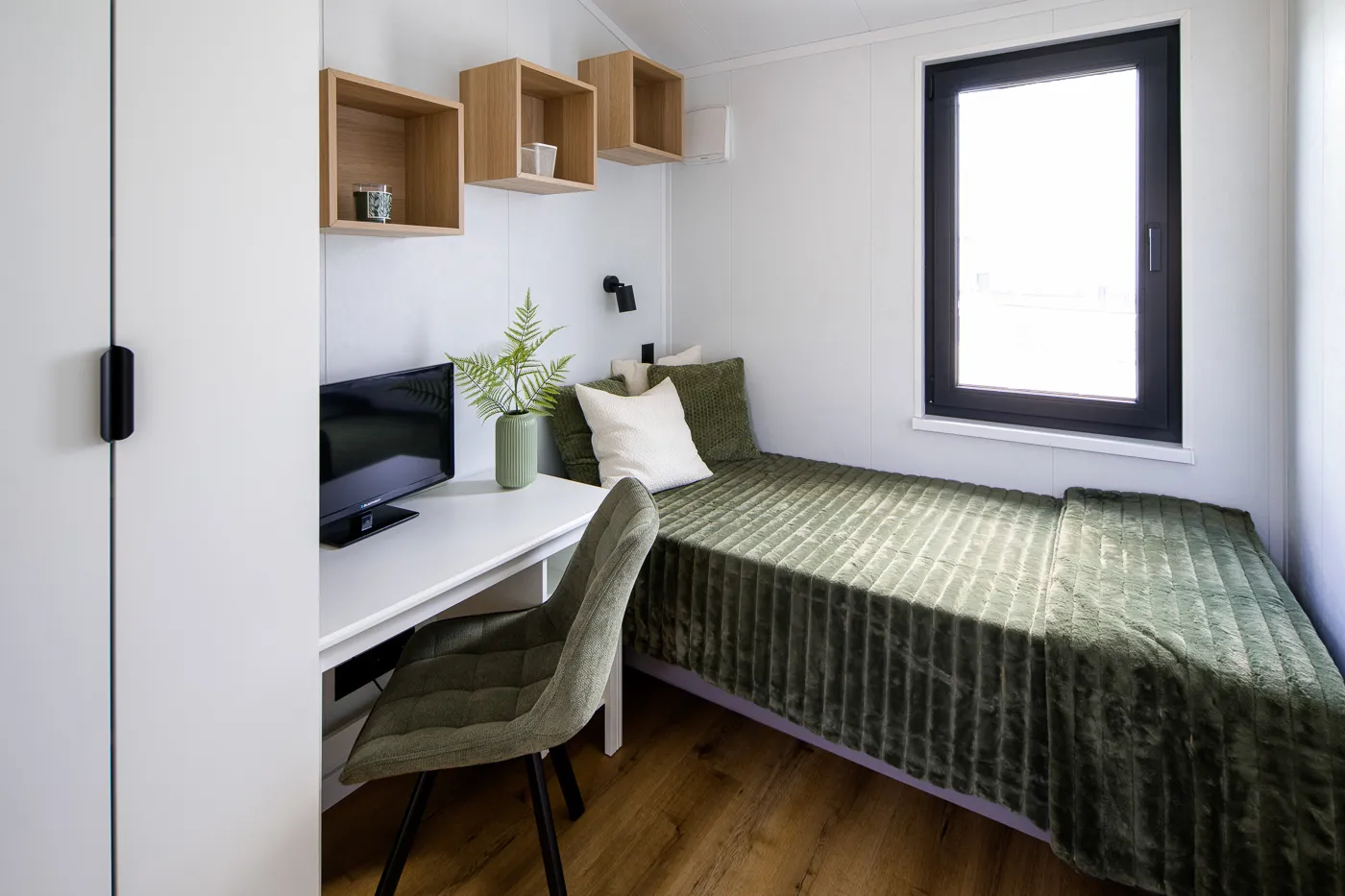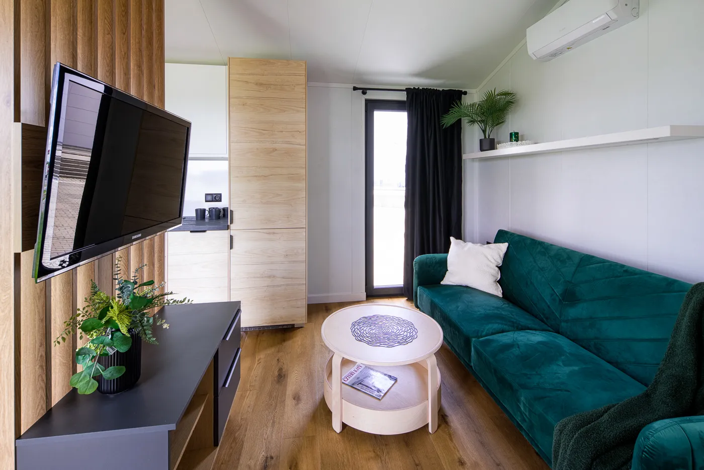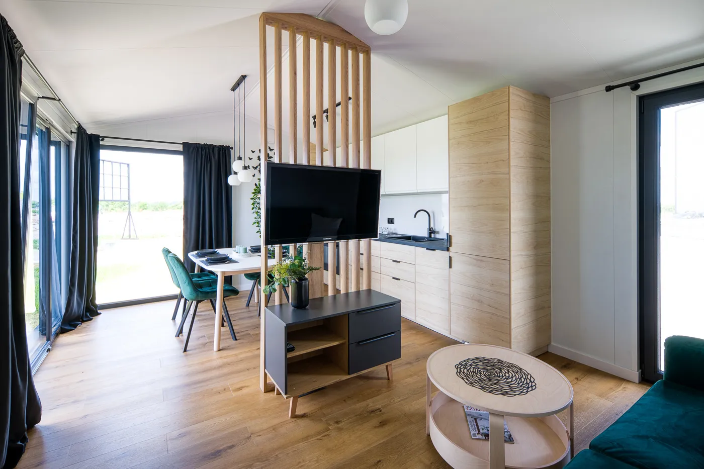 Model Natuur is een moderne modulaire vakantiewoning met een heldere, rustige vormgeving en grote raampartijen in zowel de woonkamer als de slaapkamer. Dankzij deze grote beglazing valt er veel natuurlijk licht binnen en ontstaat er een open gevoel, met een sterke verbinding tussen het interieur en de omliggende natuur.