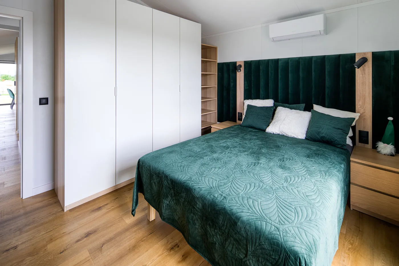 De vloerafwerking bestaat uit hoogwaardige, waterbestendige PVC vloerdelen die zorgen voor een duurzame en onderhoudsvriendelijke afwerking. De binnenwanden worden afgewerkt met FORESTIA wandpanelen, terwijl in de badkamer waterbestendige VILO wandpanelen worden toegepast.